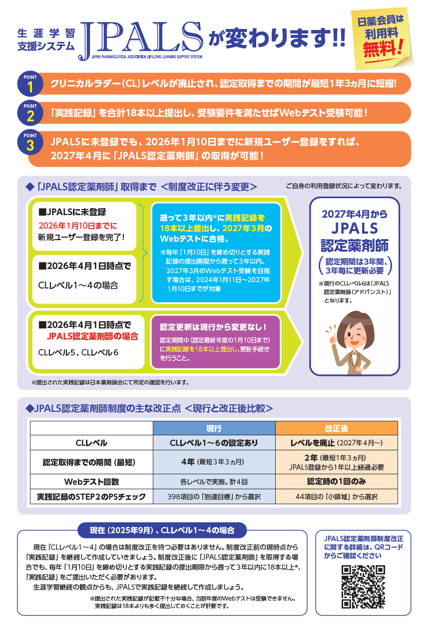 現行の制度では、JPALS認定薬剤師取得(CLレベル5)まで4年かかりますが、改正後は2年(最短1年3か月)での認定取得が可能となります。詳しくは、下記のチラシをご確認ください。